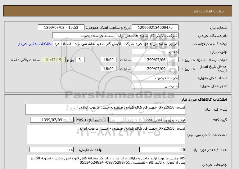 نام دستگاه خریدار:شرکت پالایش گاز شهید هاشمی نژاد - استان خراسان رضوی
