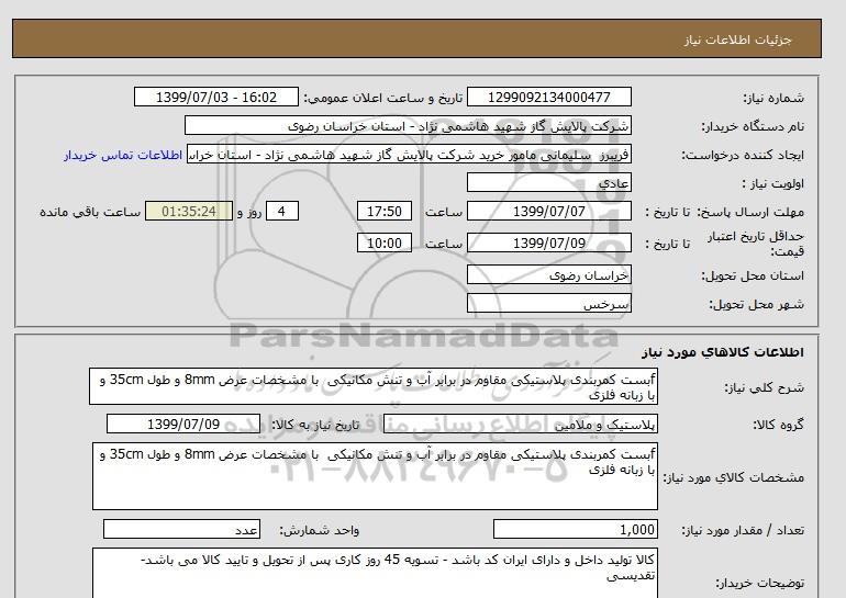 نام دستگاه خریدار:شرکت پالایش گاز شهید هاشمی نژاد - استان خراسان رضوی