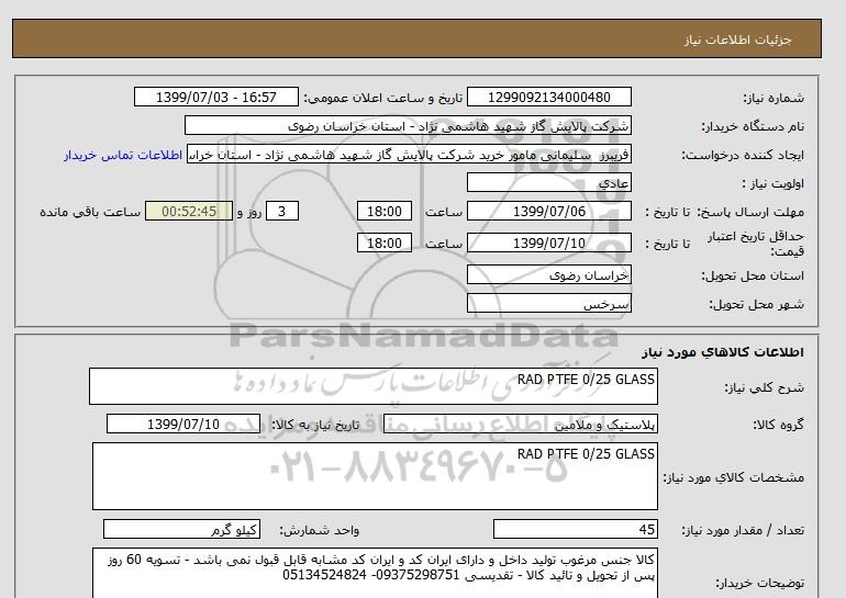 نام دستگاه خریدار:شرکت پالایش گاز شهید هاشمی نژاد - استان خراسان رضوی