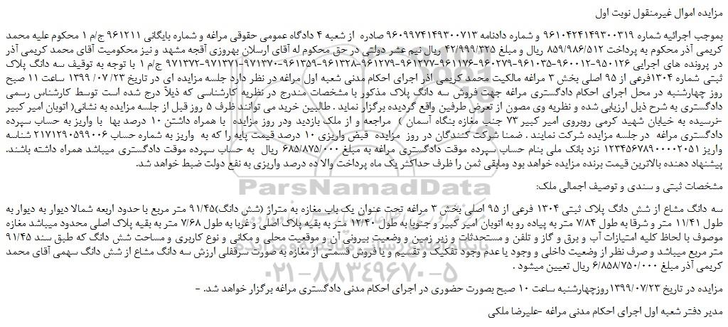 بموجب اجرائیه شماره 9610424149300319 و شماره دادنامه 9609974149300713 صادره از شعبه 4 دادگاه عمومی حقوقی مراغه و شماره بایگانی 961211 ج/م 1 محکوم علیه محمد کریمی آذر محکوم به پرداخت 859/986/512 ریال و مبلغ 42/999/325 ریال نیم عشر دولتی در حق محکوم له آقای ارسلان بهروزی آقجه مشهد و نیز محکومیت آقای محمد کریمی آذر در پرونده های اجرایی 950126-960012-961035-960279-961176-961277-961279-961328-961359-971370-971371-971372 ج/م 1 با توجه به توقیف سه دانگ پلاک ثبتی شماره 1304فرعی از 95 اصلی بخش 3 مراغه مالکیت محمد کریمی اذر اجرای احکام مدنی شعبه اول مراغه در نظر دارد جلسه مزایده ای در تاریخ 23/ 07/ 1399 ساعت 11 صبح روز چهارشنبه در محل اجرای احکام دادگستری مراغه جهت فروش سه دانگ پلاک مذکور با مشخصات مندرج در نظریه کارشناسی که ذیلآ درج شده است توسط کارشناس رسمی دادگستری به شرح ذیل ارزیابی شده و نظریه وی مصون از تعرض طرفین واقع گردیده برگزار نماید . طالبین خرید می توانند ظرف 5 روز قبل از جلسه مزایده به نشانی( اتوبان امیر کبیر -نرسیده به خیابان شهید کرمی روبروی امیر کبیر 73 جنب مغازه بنگاه آسمان ) مراجعه و از ملک بازدید ودر روز مزایده با همراه داشتن 10 درصد بها با واریز به حساب سپرده دادگستری مراغه در جلسه مزایده شرکت نمایند . ضمنا شرکت کنندگان در روز مزایده قبض واریزی 10 درصد قیمت پایه را که به واریز به شماره حساب 2171290599006 شناسه واریز 12345678900002051 نزد بانک ملی بنام حساب سپرده موقت دادگستری مراغه به مبلغ 685/875/000 ریال به حساب سپرده موقت دادگستری میباشد همراه داشته باشند. پیشنهاد دهنده بالاترین قیمت برنده مزایده خواهد بود ومابقی ثمن را ظرف حداکثر یک ماه پرداخت والا ده درصد واریزی به نفع دولت ضبط خواهد شد.