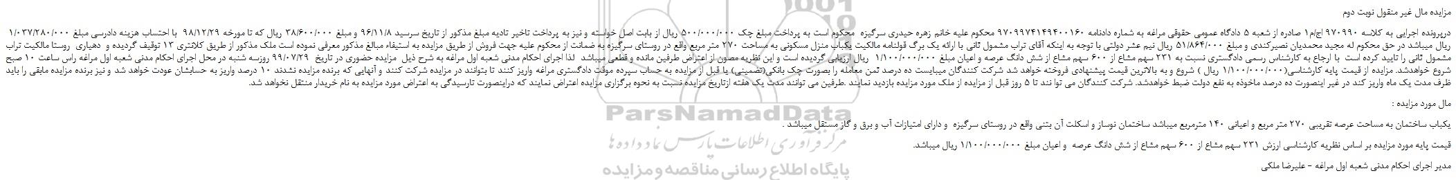 درپرونده اجرایی به کلاسه 970990 اج/م1 صادره از شعبه 5 دادگاه عمومی حقوقی مراغه به شماره دادنامه 9709974149400160 محکوم علیه خانم زهره حیدری سرگیزه محکوم است به پرداخت مبلغ چک 500/000/000 ریال از بابت اصل خواسته و نیز به پرداخت تاخیر تادیه مبلغ مذکور از تاریخ سرسید 96/11/8 و مبلغ 38/600/000 ریال که تا مورخه 98/12/29 با احتساب هزینه دادرسی مبلغ 1/037/280/000 ریال میباشد در حق محکوم له مجید محمدیان نصیرکندی و مبلغ 51/864/000 ریال نیم عشر دولتی با توجه به اینکه آقای تراب مشمول ثانی با ارائه یک برگ قولنامه مالکیت یکباب منزل مسکونی به مساحت 270 متر مربع واقع در روستای سرگیزه به ضمانت از محکوم علیه جهت فروش از طریق مزایده به استیفاء مبالغ مذکور معرفی نموده است ملک مذکور از طریق کلانتری 13 توقیف گردیده و دهیاری روستا مالکیت تراب مشمول ثانی را تایید کرده است با ارجاع به کارشناس رسمی دادگستری نسبت به 231 سهم مشاع از 600 سهم مشاع از شش دانگ عرصه و اعیان مبلغ 1/100/000/000 ریال ارزیابی گردیده است و این نظریه مصون از اعتراض طرفین مانده و قطعی میباشد لذا اجرای احکام مدنی شعبه اول مراغه به شرح ذیل مزایده حضوری در تاریخ 99/07/29 روزسه شنبه در محل اجرای احکام مدنی شعبه اول مراغه راس ساعت 10 صبح شروع خواهدشد. مزایده از قیمت پایه کارشناسی(1/100/000/000 ریال ) شروع و به بالاترین قیمت پیشنهادی فروخته خواهد شد شرکت کنندگان میبایست ده درصد ثمن معامله را بصورت چک بانکی(تضمینی) یا قبل از مزایده به حساب سپرده موقت دادگستری مراغه واریز کنند تا بتوانند در مزایده شرکت کنند و آنهایی که برنده مزایده نشدند 10 درصد واریز به حسابشان عودت خواهد شد و نیز برنده مزایده مابقی را باید ظرف مدت یک ماه واریز کند در غیر اینصورت ده درصد ماخوذه به نفع دولت ضبط خواهدشد. شرکت کنندگان می توا نند تا 5 روز قبل از مزایده از ملک مورد مزایده بازدید نمایند .طرفین می توانند مدت یک هفته ازتاریخ مزایده نسبت به نحوه برگزاری مزایده اعتراض نمایند که دراینصورت تارسیدگی به اعتراض مورد مزایده به نام خریدار منتقل نخواهد شد.