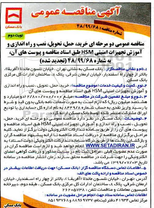 بانک مسکن در نظر دارد مناقصه عمومی دو مرحله ای خرید ، حمل ، تحویل، نصب و راه اندازی و آموزش تجهیزات امنیتی HSM طبق اسناد مناقصه و پیوست های آن را از طریق سامانه تدارکات الکترونیکی دولت برگزار نماید. کلیه مراحل برگزاری مناقصه از دریافت اسناد مناقصه تا ارائه پیشنهاد مناقصه گران و بازگشایی پاکتها از طریق درگاه سامانه تدارکات الکترونیکی دولت (ستاد) به ادرس  سامانه ستاد ایران  انجام خواهد شد و لازم است مناقصه گران در صورت عدم عضویت قبلی مراحل ثبت نام در سایت مذکور و دریافت گواهی امضای الکترونیکی را جهت شرکت در مناقصه محقق سازند تاریخ انتشار مناقصه در سامانه تاریخ 99.7.3 می باشد