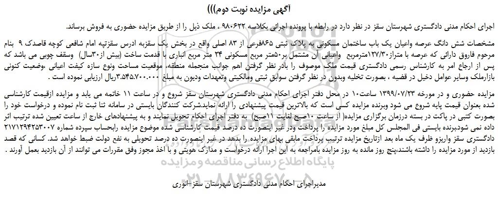 اجرای احکام مدنی دادگستری شهرستان سقز در نظر دارد در رابطه با پرونده اجرائی بکلاسه 980622 ، ملک ذیل را از طریق مزایده حضوری به فروش برساند.
