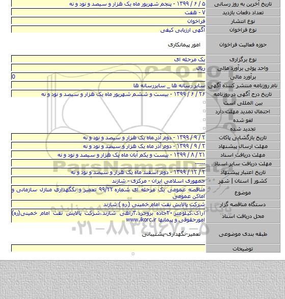مناقصه عمومی یک مرحله ای شماره ۹۹/۲۲ تعمیر و نکگهداری منازل سازمانی و اماکن عمومی