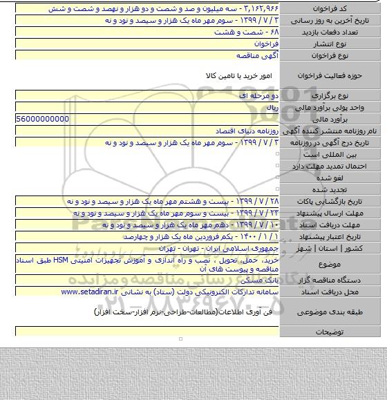 خرید، حمل، تحویل ، نصب و راه اندازی و آموزش تجهیزات امنیتی HSM طبق اسناد مناقصه و پیوست های آن