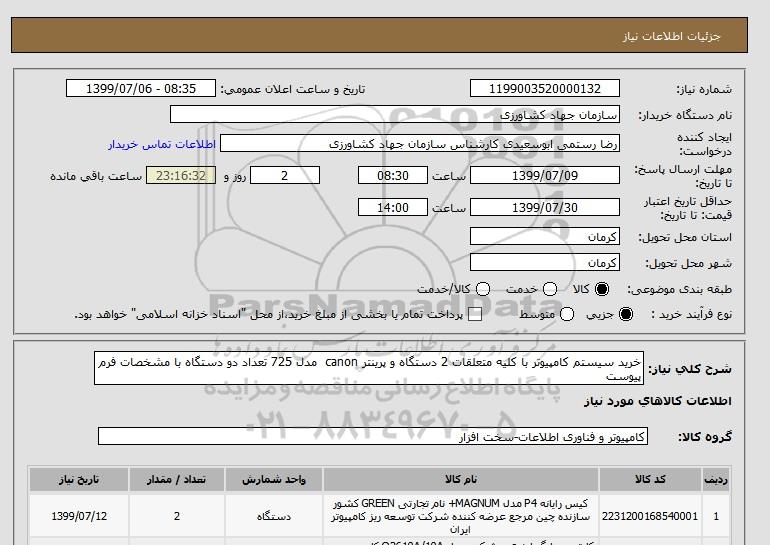 شرح کلی نیاز: خرید سیستم کامپیوتر با کلیه متعلقات 2 دستگاه و پرینتر canon مدل 725 تعداد دو دستگاه با مشخصات فرم پیوست