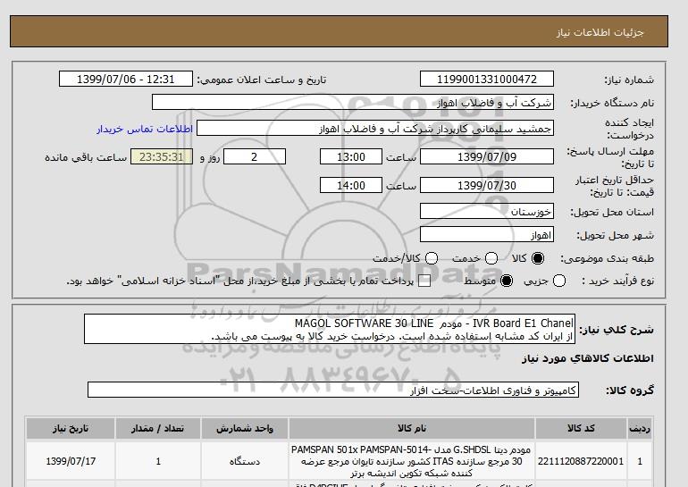 استعلام IVR Board E1 Chanel - مودم MAGOL SOFTWARE 30 LINE از ایران کد مشابه استفاده شده است. درخواست خرید کالا به پیوست می باشد., استعلام IVR Board E1 Chanel - مودم MAGOL SOFTWARE 30 LINE از ایران کد مشابه استفاده شده است. درخواست خرید کالا به پیوست می باشد.