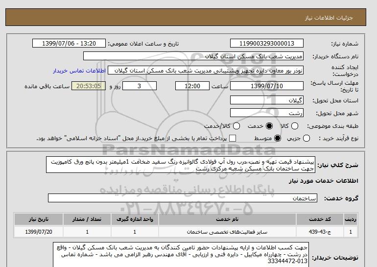 شرح کلی نیاز: پیشنهاد قیمت تهیه و نصب درب رول آپ فولادی گالوانیزه رنگ سفید ضخامت 1میلیمتر بدون پانچ ورق کامپوزیت جهت ساختمان بانک مسکن شعبه مرکزی رشت