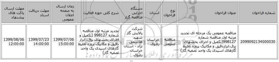 | 2099092134000030 | مناقصه عمومی یک مرحله ای تجدید مرتبه اول مناقصه شماره 998127(تکمیل و اجرای بخشهای برق،ابزاردقیق و مکانیک پروژه تغلیظ گازهای اسیدی یک واحد تصفیه گاز) | مناقصه عمومی | خراسان رضوی | شرکت پالایش گاز شهید هاشمی نژاد - استان خراسان رضوی | تجدید مرتبه اول مناقصه شماره 998127 (تکمیل و اجرای بخشهای برق، ابزار دقیق و مکانیک پروژه تغلیظ گازهای اسیدی یک واحد تصفیه گاز) | 1399/07/06 15:00:00 | 1399/07/23 14:00:00 | 1399/08/06 12:00:00 |