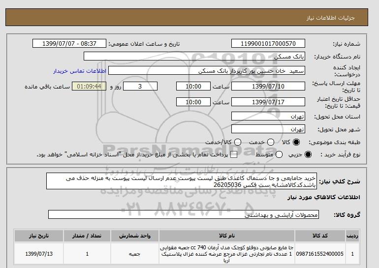 شرح کلی نیاز: خرید جامایعی و جا دستمال کاغذی طبق لیست پیوست عدم ارسال لیست پیوست به منزله حذف می باشدکدکالامشابه ست فکس 26205036
