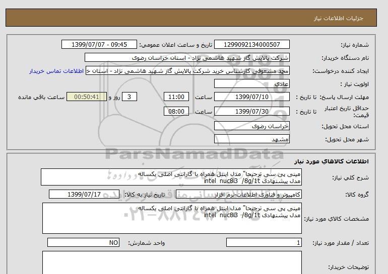 نام دستگاه خریدار:شرکت پالایش گاز شهید هاشمی نژاد - استان خراسان رضوی