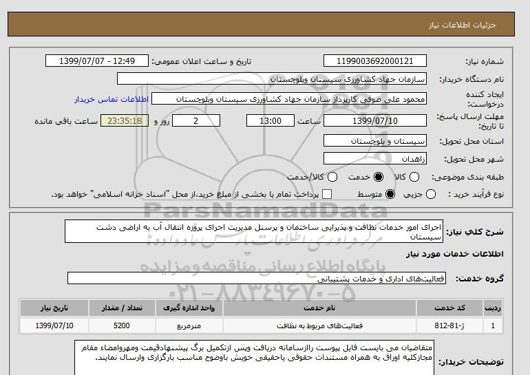 شرح کلی نیاز: اجرای امور خدمات نظافت و پذیرایی ساختمان و پرسنل مدیریت اجرای پروزه انتقال آب به اراضی دشت سیستان