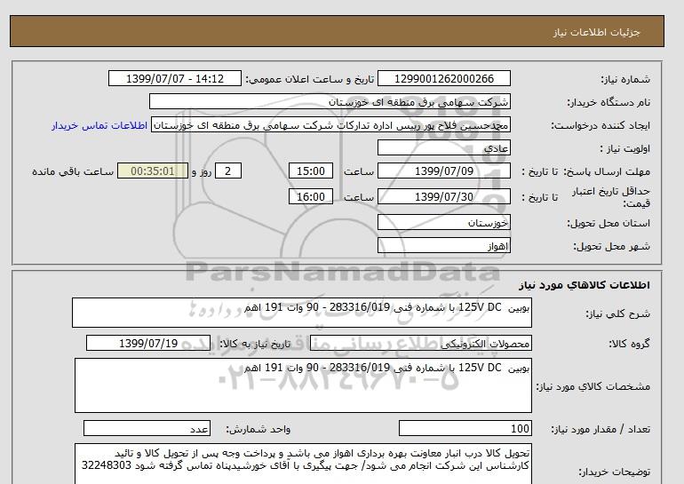 شرح کلی نیاز: بوبین 125V DC با شماره فنی 283316/019 - 90 وات 191 اهم