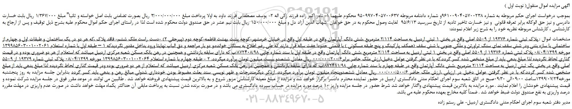 مشخصات اموال : پلاک ثبتی شماره 19376 از 5509 اصلی واقع در بخش 1 ثبتی اردبیل به مساحت 2/114 مترمربع ،شش دانگ آپارتمان واقع در طبقه اول واقع در خیابان خرمشهر-کوچه پشت بهشت فاطمه-کوچه دوم (پیرحقی 2) -دست راست ملک ششم- فاقد پلاک ،که هر دو در یک ساختمان و طبقات اول و چهارم از ساختمانی با سازه بتنی ودر شش سقف نمای سنگ تراورتن و ملکی جنوبی با شش سقف (همکف پارکینگ و پنج طبقه مسکونی ) با قدمتی حدودا هفت ساله قرار دارند که علی رغم اطلاع به بستگان خوانده،و دو بار مراجعه و دق الباب نهایتا ورود بداخل مقدور نگردیدکه 1 – طبقه اول با شماره استعلام 139985603001002061 مورخه 08/04/1399 پلاک ثبتی شماره 19376 از 5509 اصلی واقع در بخش 1 ثبتی اردبیل به مساحت 2/114 مترمربع ،شش دانگ آپارتمان واقع در طبقه اول با سند شماره چاپی 872408/98/ب که دارای سابقه بازداشتی و همچنین در رهن بانک مسکن شعبه مرکزی اردبیل میباشد که استعلام از هر دو ضروری بوده و در قیمت گذاری لحاظ نگردیده لذا مبلغ بدهی باید از مبلغ مشخص شده کسر گردد.که با در نظر گرفتن عوامل دخیل،ارزش ملک حاضر برابر000/000/200/6 ریال معادل ششصدو بیست میلیون تومان برآورد میگردد. 2 - طبقه چهارم با شماره استعلام 139985603001002064 مورخه 08/04/1399 پلاک ثبتی شماره 19379 از 5509 اصلی واقع در بخش یک ثبتی اردبیل به مساحت 2/114 مترمربع ،شش دانگ آپارتمان واقع در طبقه چهارم با سند شماره چاپی 872411/98/ب که دارای سابقه بازداشتی و همچنین در رهن بانک مسکن شعبه مرکزی اردبیل میباشد که استعلام از هر دو ضروری بوده ودر قیمت گذاری لحاظ نگردیده لذا مبلغ بدهی باید از مبلغ مشخص شده کسر گردد.که با در نظر گرفتن عوامل دخیل در ارزیابی ،ارزش ملک حاضر 000/000/500/6 ریال معادل ششصدوپنجاه میلیون تومان برآورد میگردد. ازذکر دیگرمندرجات و ظهر نویسی سند بعلت مضبوط بودن خودداری شدولی مبالغ رهن و بدهی باید کسر گردد بنابراین جلسه مزایده به روز پنجشنبه مورخه1399/07/24ساعت 09:00الی 09:30صبح در اتاق شعبه سوم اجرای احکام مدنی دادگستری اردبیل در حضور نماینده محترم دادسرا برگزار خواهد شد و مزایده از مبلغ معینه کارشناسی مزبور شروع و به بالاترین قیمت پیشنهادی فروخته خواهد شد . طالبین می توانند در موعد مقرر فوق در جلسه مزایده شرکت نموده و قیمت پیشنهادی خودشان را اعلام نمایند . مورد مزایده به بالاترین قیمت پیشنهادی واگذار خواهد شد شرط حضور در جلسه مزایده واریز 10 درصد مورد مزایده در حساب سپرده دادگستری می باشد و در صورت برنده شدن نسبت به پرداخت مابقی آن حداکثر یکماه مهلت خواهد داشت در صورت عدم واریزی در مهلت مقرره درصد واریزی به نفع صندوق دولت ضبط خواهد شد . ضمناً کلیه مخارج بعهده محکوم علیه می باشد.