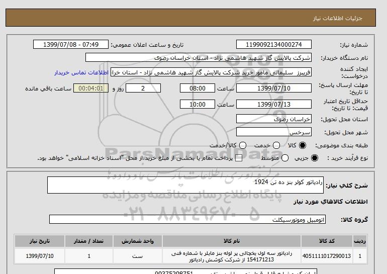 شرح کلی نیاز: رادیاتور کولر بنز ده تن 1924