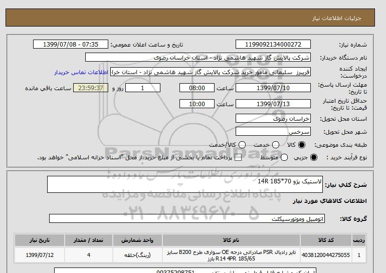 نام دستگاه خریدار:شرکت پالایش گاز شهید هاشمی نژاد - استان خراسان رضوی
