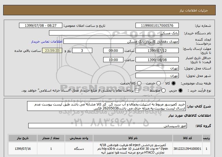 استعلام بها و موضوع استعلام استعلام خرید کمپرسور مربوط به اسپیلت،یخچال و آب سرد کن کد کالا مشابه می باشد طبق لیست پیوست عدم ارسال لیست پیوست به منزله حذف می باشد26205036 فکس به اطلاع کلیه شرکتها و افراد متخصص واجد شرایط میرساند، آگهی گذار در نظر دارد از طریق استعلام بها، نسبت به انتخاب و دریافت پیشنهادات اقدام نماید. این استعلام با کد آگهی ثبت شده در سامانه خبرگزاری پارس نماد : 2744111 منتشر شده است. مشخصات استعلام : تاریخ شروع استعلام: 1399/07/08 آخرین مهلت ارسال پیشنهاد قیمت : 1399/07/11 و محل اجرای پروژه : استان تهران میباشد. استعلام قیمت مورد درخواست : استعلام خرید کمپرسور مربوط به اسپیلت،یخچال و آب سرد کن کد کالا مشابه می باشد طبق لیست پیوست عدم ارسال لیست پیوست به منزله حذف می باشد26205036 فکس با دستهبندیهای تخصصی و گروه های مرتبط : تاسیسات ساختمانی, صنایع حرارتی و برودتی, کمپرسورهای هوا, لوازم خانگی, استعلام اطلاع رسانی میگردد. شرایط شرکت در استعلام آنلاین : ابتدا ثبت نام در سامانه استعلام پارس نماد و تکمیل مدارک موردنیاز و بارگذاری در سامانه رعایت تمامی ضوابط و الزامات مندرج در اسناد استعلام است.