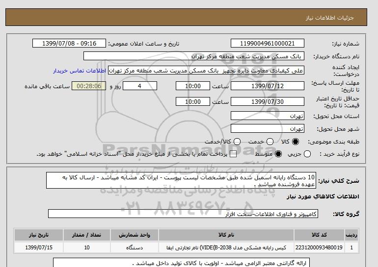 نام دستگاه خریدار: بانک مسکن مدیریت شعب منطقه مرکز تهران