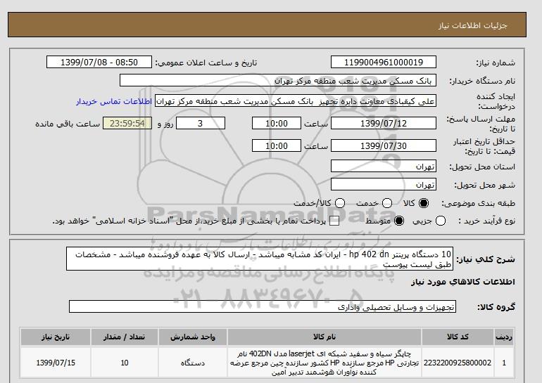 شرح کلی نیاز: 10 دستگاه پرینتر hp 402 dn - ایران کد مشابه میباشد - ارسال کالا به عهده فروشنده میباشد - مشخصات طبق لیست پیوست