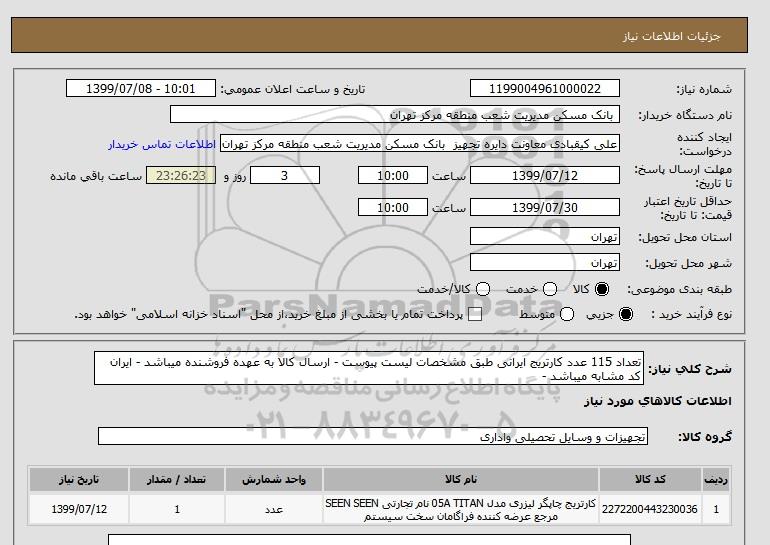 استعلام تعداد 115 عدد کارتریج ایرانی طبق مشخصات لیست پیوست - ارسال کالا به عهده فروشنده میباشد - ایران کد مشابه میباشد -, استعلام تعداد 115 عدد کارتریج ایرانی طبق مشخصات لیست پیوست - ارسال کالا به عهده فروشنده میباشد - ایران کد مشابه میباشد -