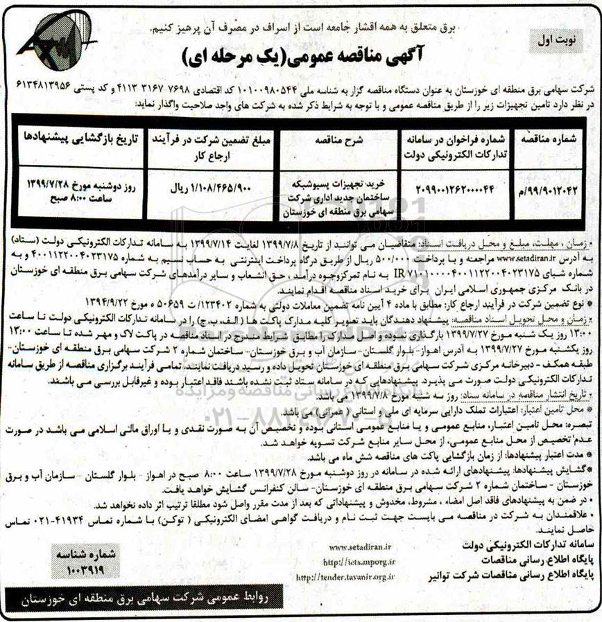| 99/9012042/م | 2099001262000044 | خرید تجهیزات پسیو شبکه ساختمان جدید اداری شرکت سهامی برق منطقه ای خوزستان | 1.108.465.900 ریال | روز دوشنبه مورخ 99.07.28 ساعت 8 صبح |
