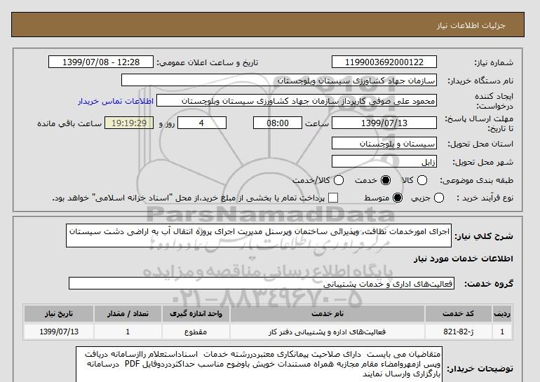 شرح کلی نیاز: اجرای امورخدمات نظافت، وپذیرائی ساختمان وپرسنل مدیریت اجرای پروژه انتقال آب به اراضی دشت سیستان