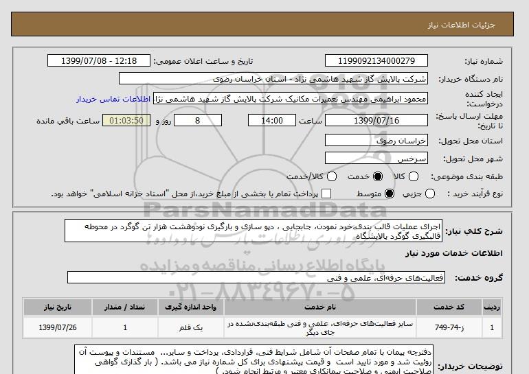 نام دستگاه خریدار:شرکت پالایش گاز شهید هاشمی نژاد - استان خراسان رضوی
