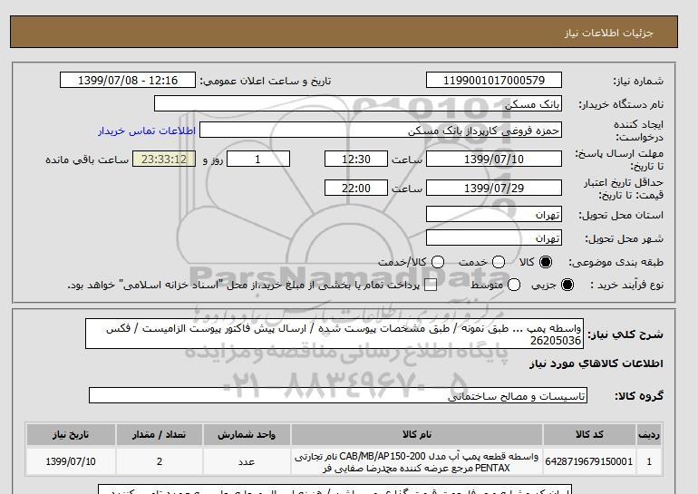 شرح کلی نیاز: واسطه پمپ ... طبق نمونه / طبق مشخصات پیوست شده / ارسال پیش فاکتور پیوست الزامیست / فکس 26205036