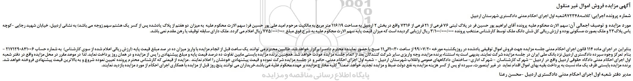 مورد مزایده و توصیف اجمالی آن: سهم الارث محکوم علیه پرونده آقای ابراهیم پور حسین فر در پلاک ثبتی 76 فرعی از 21 فرعی از 7316 واقع در بخش 2 اردبیل به مساحت 116/19 متر مربع به مالکیت مرحوم امید علی پور حسین فر( سهم الارث محکوم علیه به میزان دو هفتم از پلاک یادشده پس از کسر یک هشتم سهم زوجه می باشد) به نشانی اردبیل، خیابان شهید رجایی -کوچه یاس پلاک23 و ملک بصورت مسکونی بوده و ارزش ریالی کل شش دانگ ملک توسط کارشناس منتخب پرونده 3/100/000/000 ریال ارزیابی گردیده است که میزان قیمت پایه سهم الارث محکوم علیه به شرح فوق مبلغ 775/000/000 ریال اعلام می گردد. ملک دارای سابقه توقیف یا رهن مقدم نمی باشد.