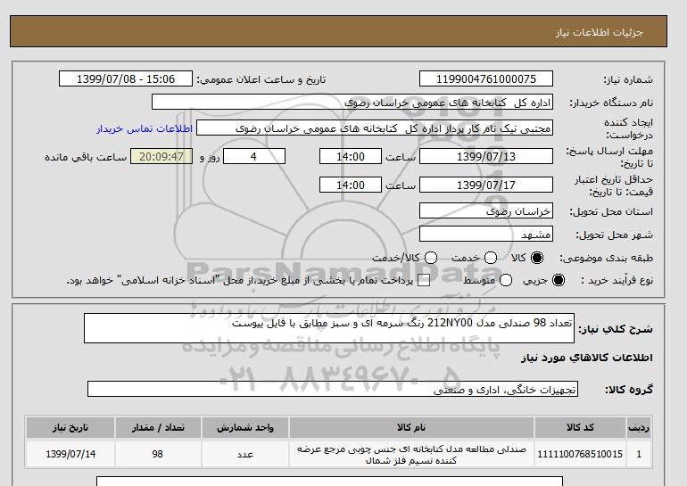 شرح کلی نیاز: تعداد 98 صندلی مدل 212NY00 رنگ سرمه ای و سبز مطابق با فایل ییوست