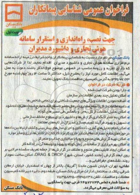 بانک مسکن در نظر دارد نسبت به شناسایی پیمانکاران واجد شرایط در زمینه ارائه سامانه نرم افزاری سامانه هوش تجاری و داشبور مدیران اقدام نماید. لذا از شرکت هایی که دارای تجربه و رزومه مناسب در خصوص موضوع فوق الذکر باشند دعوت به عمل می آید اطلاعات کامل مورد نیاز را به شرح ذیل حداکثر تا ساعت 14 روز چهارشنبه مورخ 99.7.23 به آدرس کمیسیون مناقصات بانک تحویل نمایند.