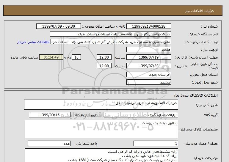 نام دستگاه خریدار:شرکت پالایش گاز شهید هاشمی نژاد - استان خراسان رضوی