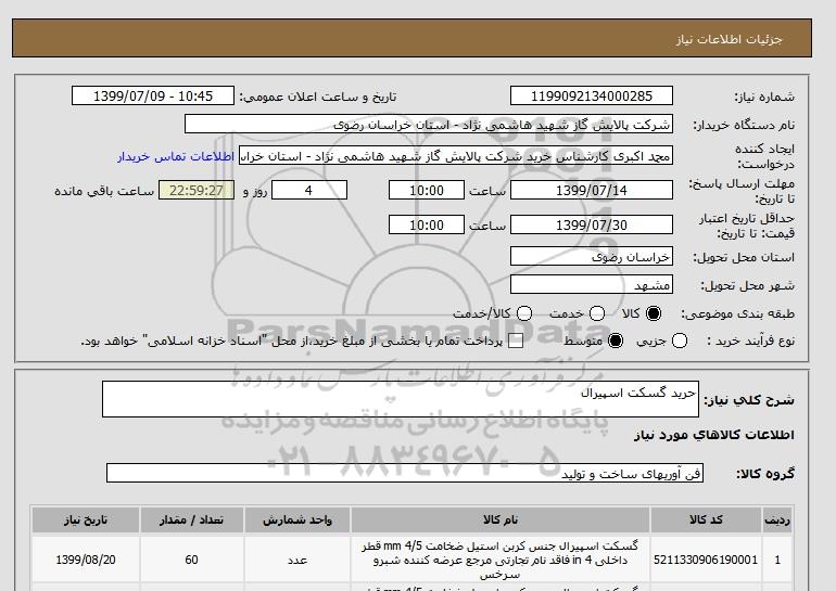 نام دستگاه خریدار:شرکت پالایش گاز شهید هاشمی نژاد - استان خراسان رضوی