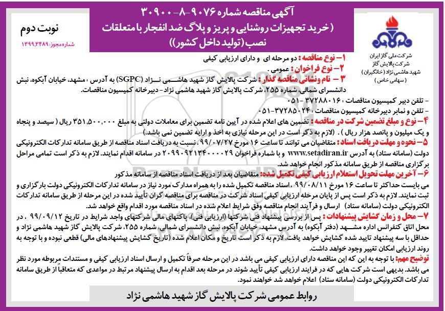 7- محل و زمان گشایش پیشنهادات: پس از بررسی پیشنهاد فنی شرکت‌ها (ارزیابی فنی)، پاکت‌های مالی شرکت‌های واجد شرایط در تاریخ 99.9.12 ، در محل اتاق کنفرانس اداره مشهد (دفتر آبکوه) به آدرس مشهد، خیابان آبکوه، نبش دانشسرای شمالی، شماره 255، شرکت پالایش گاز شهید هاشمی نژاد و حداقل با دو پیشنهاد تأیید شده گشایش خواهد یافت. لازم به ذکر است تاریخ و مکان اعلام شده (تاریخ گشایش پیشنهادهای مالی) قطعی نبوده و با توجه به روند ارزیابی امکان تغییر وجود خواهد داشت