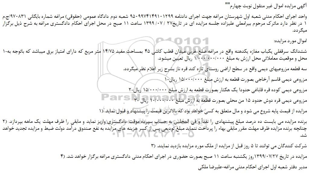 واحد اجرای احکام مدنی شعبه اول شهرستان مراغه جهت اجرای دادنامه 9509974149101299 شعبه دوم دادگاه عمومی (حقوقی) مراغه شماره بایگانی 970831/ج.م 1 در نظر دارد ماترک مرحوم بیرامعلی علیزاده جلسه مزایده ای در تاریخ27 / 07/ 1399 ساعت 11 صبح در محل اجرای احکام دادگستری مراغه به شرح ذیل برگزار میگردد.