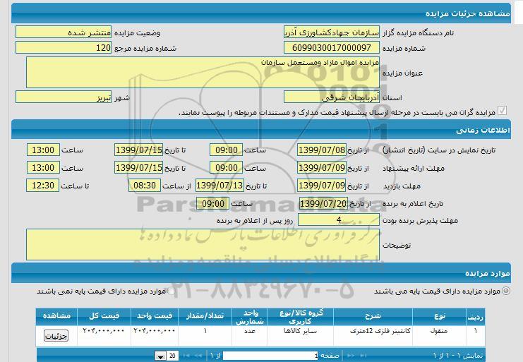 مزایده عمومی مزایده اموال مازاد و مستعمل سازمان برگزار میگردد. از کلیه افراد متخصص و شرکت‌های واجد شرایط دعوت به عمل می‌آید تا در این مزایده با کد خبرگزاری پارس نماد : 2750926 شرکت نمایند تاریخ شروع مزایده : 1399/07/09 مهلت شرکت در مزایده: تا پایان روز 1399/07/15 مکان برگزاری اموال واگذاری استان‌های مزایدات استان آذربایجان شرقی و دسته‌بندی‌های مربوط به این حراجی متفرقه میباشد.