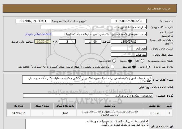 شرح کلی نیاز: خرید خدمات فنی و کارشناسی برای اجرای پروژه های پیش آگاهی و هدایت عملیات کنترل آفات در سطح 900 هکتار