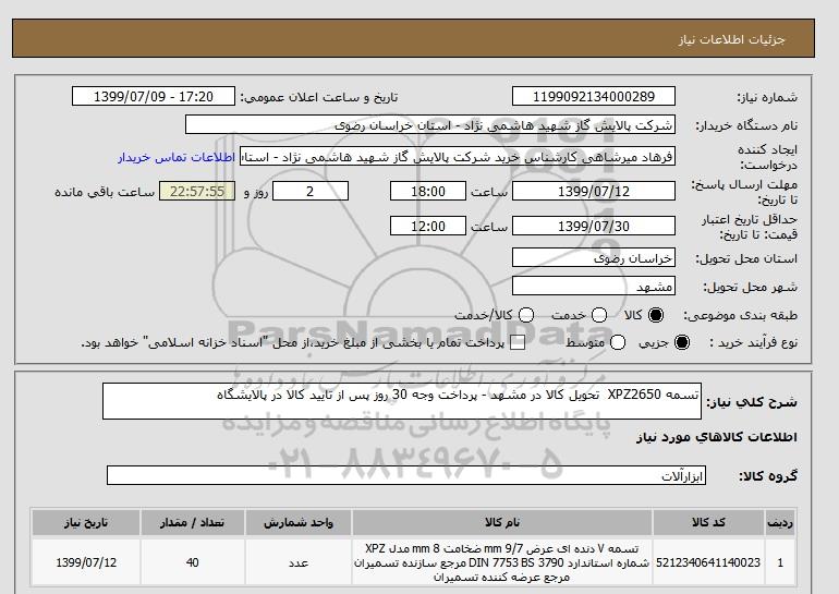 شرح کلی نیاز: تسمه XPZ2650 تحویل کالا در مشهد - پرداخت وجه 30 روز پس از تایید کالا در پالایشگاه