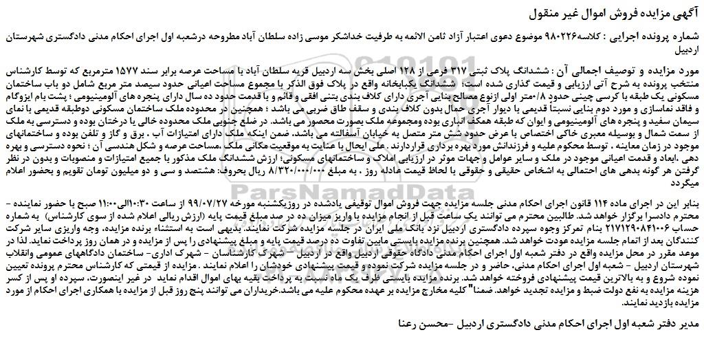 شماره پرونده اجرایی : کلاسه980226 موضوع دعوی اعتبار آزاد ثامن الائمه به طرفیت خداشکر موسی زاده سلطان آباد مطروحه درشعبه اول اجرای احکام مدنی دادگستری شهرستان اردبیل
