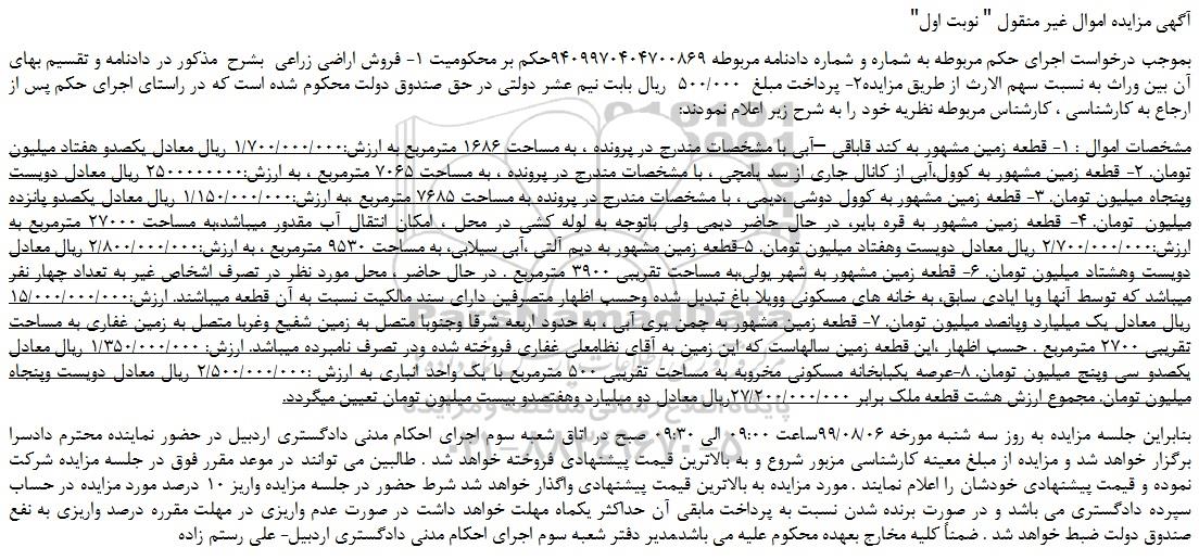 مشخصات اموال : 1- قطعه زمین مشهور به کند قاباقی –آبی با مشخصات مندرج در پرونده ، به مساحت 1686 مترمربع به ارزش:1/700/000/000 ریال معادل یکصدو هفتاد میلیون تومان. 2- قطعه زمین مشهور به کوول،آبی از کانال جاری از سد یامچی ، با مشخصات مندرج در پرونده ، به مساحت 7065 مترمربع ، به ارزش:2500000000 ریال معادل دویست وپنجاه میلیون تومان. 3- قطعه زمین مشهور به کوول دوشی ،دیمی ، با مشخصات مندرج در پرونده به مساحت 7685 مترمربع ،به ارزش:1/150/000/000 ریال معادل یکصدو پانزده میلیون تومان. 4- قطعه زمین مشهور به قره بایر، در حال حاضر دیمی ولی باتوجه به لوله کشی در محل ، امکان انتقال آب مقدور میباشد،به مساحت 27000 مترمربع به ارزش:2/700/000/000 ریال معادل دویست وهفتاد میلیون تومان. 5-قطعه زمین مشهور به دیم آلتی ،آبی سیلابی، به مساحت 9530 مترمربع ، به ارزش:2/800/000/000 ریال معادل دویست وهشتاد میلیون تومان. 6- قطعه زمین مشهور به شهر یولی،به مساحت تقریبی 3900 مترمربع . در حال حاضر ، محل مورد نظر در تصرف اشخاص غیر به تعداد چهار نفر میباشد که توسط آنها ویا ایادی سابق، به خانه های مسکونی وویلا باغ تبدیل شده وحسب اظهار متصرفین دارای سند مالکیت نسبت به آن قطعه میباشند. ارزش:15/000/000/000 ریال معادل یک میلیارد وپانصد میلیون تومان. 7- قطعه زمین مشهور به چمن یری آبی ، به حدود اربعه شرقا وجنوبا متصل به زمین شفیع وغربا متصل به زمین غفاری به مساحت تقریبی 2700 مترمربع . حسب اظهار ،این قطعه زمین سالهاست که این زمین به آقای نظامعلی غفاری فروخته شده ودر تصرف نامبرده میباشد. ارزش: 1/350/000/000 ریال معادل یکصدو سی وپنج میلیون تومان. 8-عرصه یکبابخانه مسکونی مخروبه به مساحت تقریبی 500 مترمربع با یک واحد انباری به ارزش :2/500/000/000 ریال معادل دویست وپنجاه میلیون تومان. مجموع ارزش هشت قطعه ملک برابر 27/200/000/000ریال معادل دو میلیارد وهفتصدو بیست میلیون تومان تعیین میگردد.