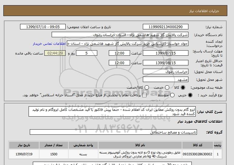 نام دستگاه خریدار:شرکت پالایش گاز شهید هاشمی نژاد - استان خراسان رضوی