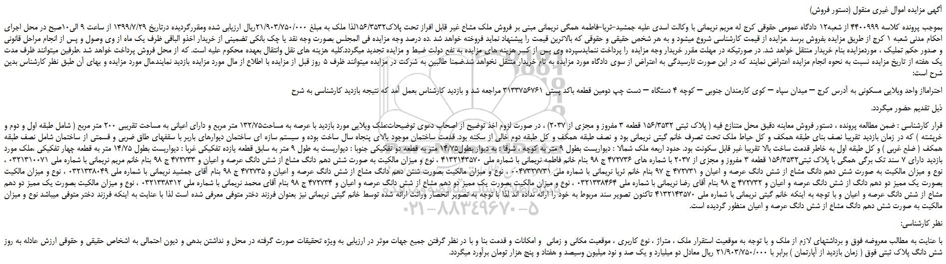 بموجب پرونده کلاسه 4400999 از شعبه12 دادگاه عمومی حقوقی کرج له مریم نریمانی با وکالت اسدی علیه جمشید-ثریا-فاطمه همگی نریمانی مبنی بر فروش ملک مشاع غیر قابل افراز تحت پلاک156/3532لذا ملک به مبلغ 21/903/750/000ریال ارزیابی شده ومقررگردیده درتاریخ 1399/7/29 از ساعت 9 الی10صبح در محل اجرای احکام مدنی شعبه 1 کرج از طریق مزایده بفروش برسد .مزایده از قیمت کارشناسی شروع میشود و به هر شخص حقیقی و حقوقی که بالاترین قیمت را پیشنهاد نماید فروخته خواهد شد .ده درصد وجه مزایده فی المجلس بصورت وجه نقد یا چک بانکی تضمینی از خریدار اخذو الباقی ظرف یک ماه از وی وصول و پس از انجام مراحل قانونی و صدور حکم تملیک ، موردمزایده بنام خریدار منتقل خواهد شد. در صورتیکه در مهلت مقرر خریدار وجه مزایده را پرداخت ننمایدسپرده وی پس از کسر هزینه های مزایده به نفع دولت ضبط و مزایده تجدید میگردد.کلیه هزینه های نقل وانتقال بعهده محکوم علیه است. که از محل فروش پرداخت خواهد شد .طرفین میتوانند ظرف مدت یک هفته از تاریخ مزایده نسبت به نحوه انجام مزایده اعتراض نمایند که در این صورت تارسیدگی به اعتراض از سوی دادگاه مورد مزایده به نام خریدار منتقل نخواهد شد.ضمنا طالبین به شرکت در مزایده میتوانند ظرف 5 روز قبل از مزایده با اطلاع از مال مورد مزایده بازدید نمایند.مال مورد مزایده و بهای آن طبق نظر کارشناس بدین شرح است: