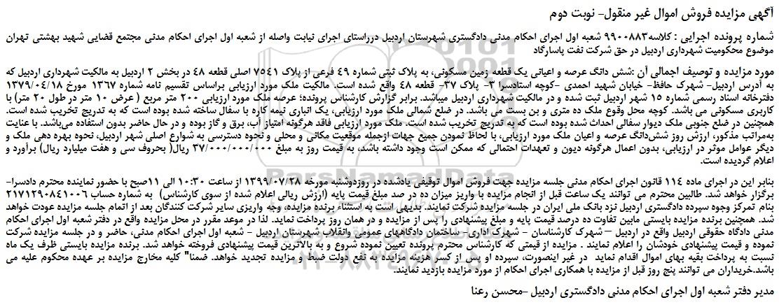 شماره پرونده اجرایی : کلاسه9900883 شعبه اول اجرای احکام مدنی دادگستری شهرستان اردبیل درراستای اجرای نیابت واصله از شعبه اول اجرای احکام مدنی مجتمع قضایی شهید بهشتی تهران موضوع محکومیت شهرداری اردبیل در حق شرکت نفت پاسارگاد