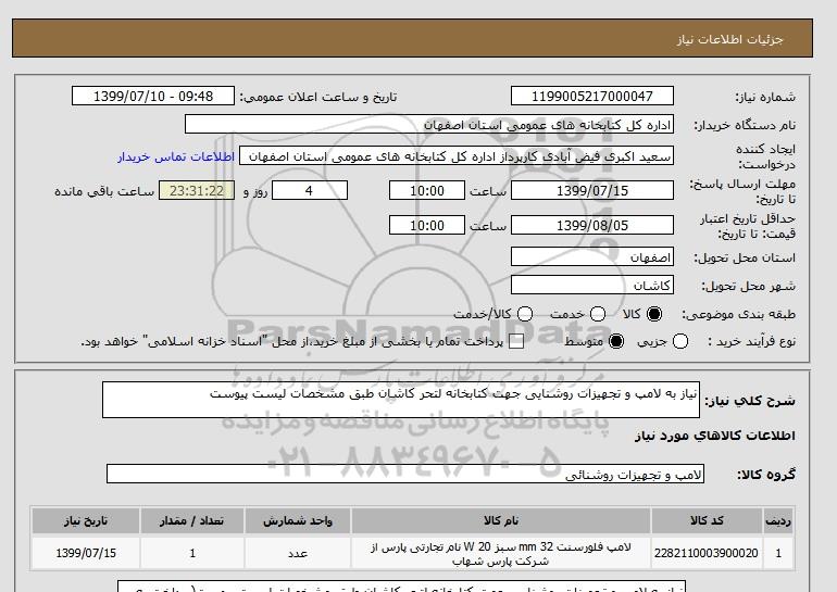 شرح کلی نیاز: نیاز به لامپ و تجهیزات روشنایی جهت کتابخانه لتحر کاشان طبق مشخصات لیست پیوست