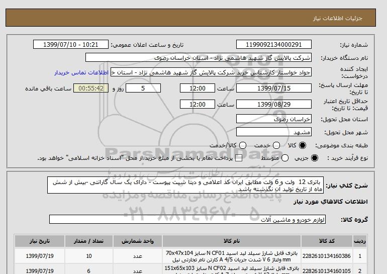 نام دستگاه خریدار:شرکت پالایش گاز شهید هاشمی نژاد - استان خراسان رضوی