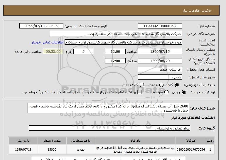 استعلام 2600 شل آب معدنی 1.5 لیتری مطابق ایران کد اعلامی - از تاریخ تولید بیش از یک ماه نگذشته باشد - هزینه حمل با فروشنده , استعلام 2600 شل آب معدنی 1.5 لیتری مطابق ایران کد اعلامی - از تاریخ تولید بیش از یک ماه نگذشته باشد - هزینه حمل با فروشنده