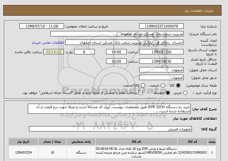 شرح کلی نیاز: خرید ده دستگاه DVR 32CH طبق مشخصات پیوست. ایران کد مشابه است و صرفا جهت درج قیمت از آن استفاده شده است.