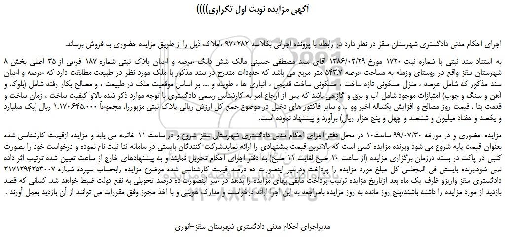 اجرای احکام مدنی دادگستری شهرستان سقز در نظر دارد در رابطه با پرونده اجرائی بکلاسه 970282 ،املاک ذیل را از طریق مزایده حضوری به فروش برساند.