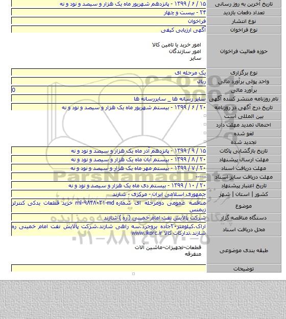 مناقصه عمومی دومرحله ای شماره rnl-۹۸۴۸۰۳۱-md خرید قطعات یدکی کنترلر زیمنس