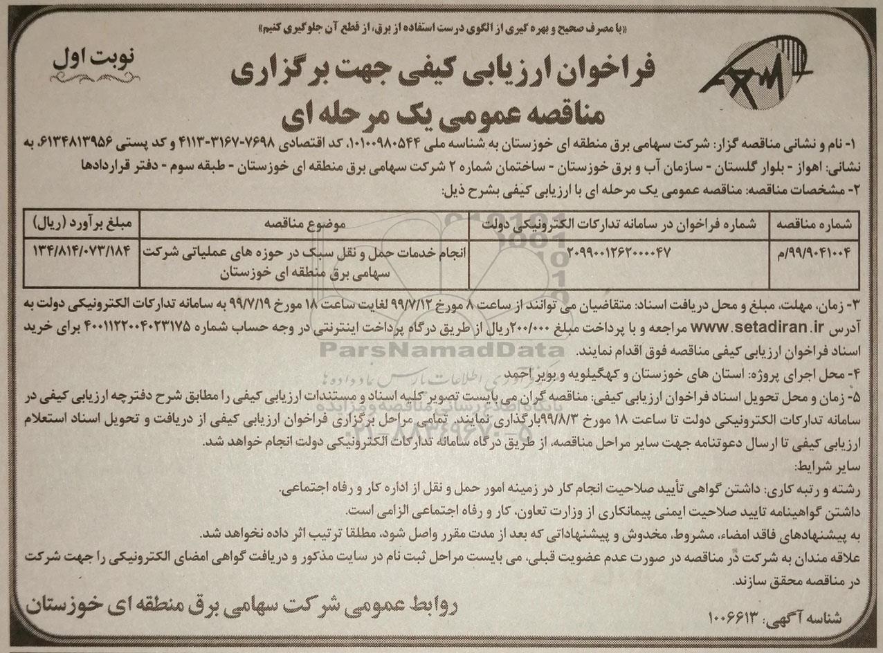 | 99/9041004/م | 2099001262000047 | انجام خدمات حمل و نقل سبک در حوزه های عملیاتی شرکت سهامی برق منطقه ای خوزستان | 134.814.073.184 |